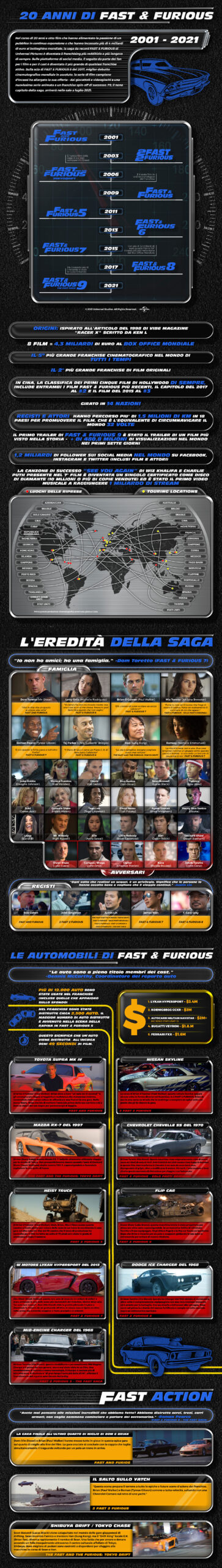 In vista dell'uscita di F9, il nono capitolo della saga, nelle sale da luglio 2021, Universal Pictures ha condiviso l'infografica sui 20 anni della saga Fast and Furious, che ha esordito con il primo film uscito nel 2001.