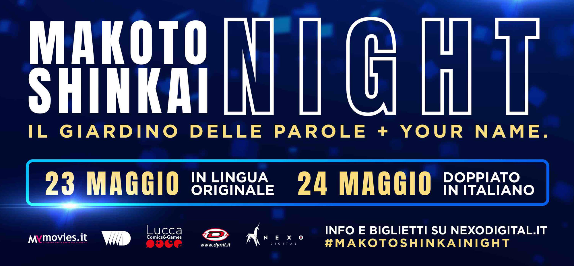 In occasione dei 50 anni di Makoto Shinkai, artista giapponese considerato l'erede di Hayao Miyazaki, Nexo Digital e Dynit, dopo aver riportato al cinema Akira 35 anni dopo la prima uscita, hanno programmato due serate-maratona nelle sale cinematografiche italiane per riportare sul grande schermo Your Name. e Il Giardino delle Parole, due lungometraggio firmati da Makoto Shinkai. Il primo appuntamento è per martedì 23 maggio con proiezioni in lingua originale con sottotitoli in italiano, seguito dall'appuntamento di mercoledì 24 maggio con proiezioni in versione doppiata in italiano.