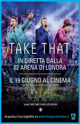 In diretta dall'Arena O2 di Londra i Take That arrivano in tutte le sale The Space Cinema e in 43 multisale del circuito UCI Cinemas, Venerdì 19 giugno alle ore 20:50, con l'impressionante concerto/spettacolo ricco di sorprese: tandem sidecar che volano sopra il pubblico, sfere incendiate, coreografie mozzafiato e un'improvvisa tempesta al coperto saranno solo alcuni degli elementi che accompagneranno i brani della band cult degli anni '90.